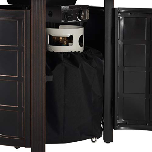 Details: Enjoy your patio in all seasons with this Columbia 34" Round Aluminum LPG Fire Pit Table by Fire Sense. Constructed of sturdy aluminum and featuring an attractive antique bronze finish, this practical and durable fire pit table features a 37,000 BTU stainless steel burner and clear fire glass producing beautiful, full flames. The well built and classic design give this outdoor fire pit the chic style you want and high quality that will last for years to come. This metal fire pit uses a standard 20 pound LPG propane tank which is not included with your purchase and can be easily added behind the convenient hinged door. The portable fire pit features an electronic ignition system that will turn on the heater in an instant so that you do not have to wait around for the air around you to be heated. Also, this way you only use the fuel you need. A very cost efficient way of having your next porch campfire. This eye catching propane fire pit also doubles as an attractive outdoor patio table. Simply add or remove the convenient aluminum fire bowl lid with flush mounted handle as desired to access the fire pit in every season. We have also included a vinyl weather cover for the fire pit and the propane tank with the package for your convenience. Whether you are using this large fire pit for fire purposes or general ambiance, this unique fire pit is a functional piece of art that brings comfort, quality, and style to your outdoor living space.