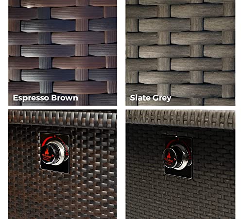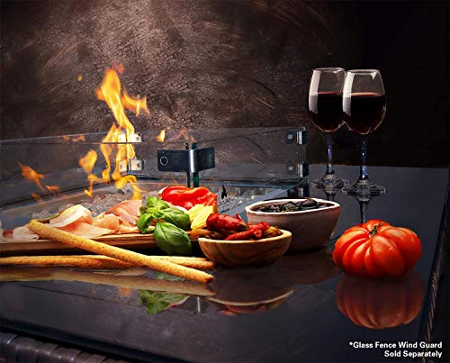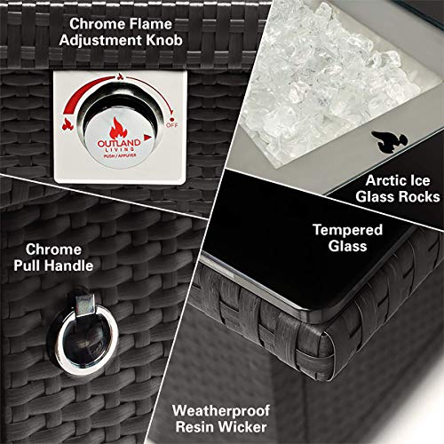 Details: Enjoy the elegance and warmth of the 42,5000 BTU high quality propane fire pit table in any outdoor living space all year round. Admire the reflection of the dancing flames on the Arctic Ice fire glass and black tempered glass tabletop while keeping warm and cozy within the heating radius of this impressive outdoor centerpiece. Durable Outland Living quality construction ensures product longevity; aluminum frame and resin wicker are both weather and rust resistant. Sit back, relax and enjoy time together with family and friends with the perfect propane fire pit table addition to the backyard, patio, deck, or poolside.Features:Propane fire pit table with auto-ignition conveniently conceals a standard 20-Lb propane tank (not included) within its base.Easily access the interior compartment to switch out the propane tank on either side through user friendly access doors with chrome pull rings.The slate grey resin wicker base compliments other patio furniture and accessories to offer a unified high end outdoor living space.Warranty Information:All Outland Living products include a One Year Manufacturer's Limited Warranty and our knowledgeable and friendly customer service support.We are committed to your satisfaction and strive to ensure that you thoroughly enjoy your Outland Living product.Accessories Now Available Separately:UV & Water Resistant Black Durable Cover8 mm Tempered Clear Glass Lid insert8 mm Tempered Clear Glass Wind Fence guardSave $20 over purchasing each accessory separately with the 3 Piece Square Accessory Set!NEW Natural Gas Conversion Kit 788 for Outland Series 410 36-Inch Square Fire Tables with 42,500 BTU only
