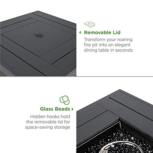 Details: Specifications: Overall Dimensions: 28"(L) x 28"(W) x 24.75"(H) Weight Capacity: 150 lbs. Weight: 59 lbs. Material: Steel, Wicker, Polyester Assembly required (with instructions) Tools Included CSA-Certified Package Includes: Fire Pit Weather Cover (1 Bag) Glass Beads Allen Wrench BCP SKU: SKY5672