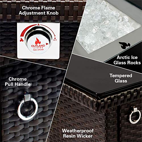 Durable Outland Living quality construction ensures product longevity; aluminum frame and resin wicker are both weather and rust resistant. Sit back, relax and enjoy time together with family and friends with the perfect propane fire pit table addition to the backyard, patio, deck, or poolside.