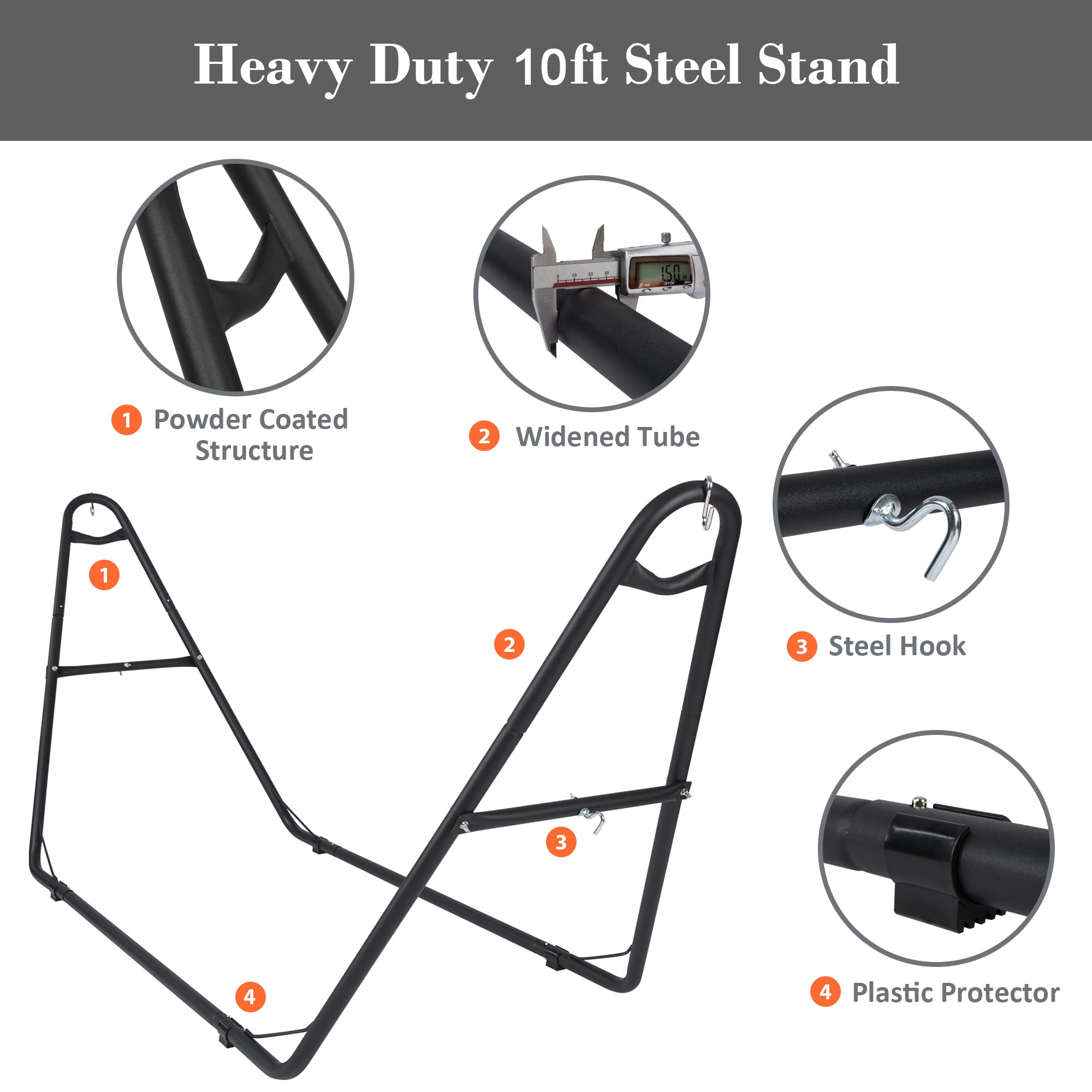 Space Saving Freestanding Hammock: No damage to trees. Created to be stable and long-lasting, the 10 ft stand is made from powder-coated heavy gauge steel and will not take up much space. It can be easily assembled in minutes without any tools just following the instruction. Feel free to contact us if you have any questions during use within one year of purchase. We are always here to help.
