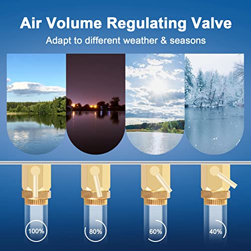 Details: Specifications Model: OLF400D-140BS-C Voltage: 120V Power: 3/4 HP/550 W Max CFM: 5.2 Max Pond Size: 3 Acres Noise Level: 65 dB Airline Size: 100'x3/8"/30.5 m x 9.5 mm Diffuser Size: 10"/25.4 cm Diffuser Base Size: 18.8 x 11.5" / 35.1 x 29.2 cm Air Compressor Size: 8.9 x 6.3 x 8.5 in / 25.5 x 16 x 21.5 cm Package Content 1 x Air Compressor 2 x Non-stick Diffusers 2 x Weighted Airline 1 x Timer 1 x User Manual