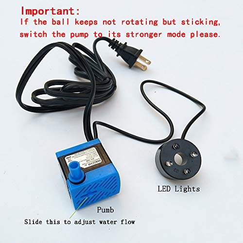 Details: Important: If the ball keeps not rotating but sticking, switch the pump to its stronger mode please. The mini tabletop fountain comes with a ball, a waterwheel and an elephant. They’re sure to bring happiness to your kids, and be an ideal gift. Rolling Crystal Ball with Changing Lights The crystal ball floats and revolves with water. The LED lights hidden below make it brighter and changed in color. Water-driven Wheel The water-driven wheel brings more fun for you and your kids. Auto Pump for Water Circulation The pump circulates the water, adding the soothing sounds of splashing water to any home patio or office setting. Decorative Tabletop Fountain The resin-rock fountain brings a calming Zen-feel to any room. It measures 6” L x 4” W x 8” H, just the right size to add a decorative accent to any tabletop or office desk. Package Includes 1x water fountain, 1x water pump and LED lights Tips Make sure the pump is properly immersed in water. Never run it without water to avoid damage. Clean it every month, and keep it from blocked.